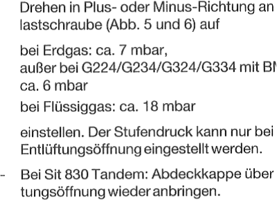 lnbetriebnahmeprotokoll notieren. Der Gasanschlußdruck muß betragen bei Erdgas E (H): min. 17 mbar, max. 25 mbar, Nennanschlußdruck20 mbar, Erdgas LL (L): min 18 mbar, max. 25 mbar, Nennanschlußdruck20 mbar, Flüssiggas: min. 42,5 mbar, max. 57,5 mbar, Nennanschlußdruck 50 mbar. Ist der benötigte Gasanschlußdruck nicht vorhan den, muß mit dem zuständigen Gasversorgungs unternehmen Rücksprache genommen werden. Bei höherem Gasanschlußdruck muß ein zusätzli cher Gasdruckregler der Gasbrennerarmatur vorgeschaltet werden. - Meßschlauch wieder abziehen und Verschluß schraube des Prüfnippels sorgfältig wieder festzie hen. • Startlast einstellen bei Sit 830 Tandem und BM 762-012: - Schalter Betrieb in Stellung 0 (AUS) stellen. - Bei Sit 830 Tandem: Abdeckkappe über der Entlüf- tungsöffnung entfernen (Abb. 5). - Verschlußschraube des Meßnippels am Gasvertei lerrohr zwei Umdrehungen lösen und Meßschlauch desU-Rohr-Manometersaufstecken. - Schalter Betrieb in Stellung 1 (EIN) stellen. - Etwa 6 Sekunden nach Erscheinen der Zündflamme die Entlüftungsöffnung z.B. mit dem Finger abdek ken. - Etwa 10 Sekunden, nachdem die Armatur geöffnet hat, erkennbar durch ein leichtes Klicken, Stufen druck am U-Rohr-Manometer ablesen und durch Drehen in Plus- oder Minus-Richtung an der Start lastschraube (Abb. 5 und 6) auf bei Erdgas: ca. 7 mbar, außer bei G224/G234/G324/G334 mit BM 762-012: ca. 6 mbar bei Flüssiggas: ca. 18 mbar einstellen. Der Stufendruck kann nur bei abgedeckter Entlüftungsöffnung eingestellt werden. - Bei Sit 830 Tandem: Abdeckkappe über der Entlüf tungsöffnung wieder anbringen. |